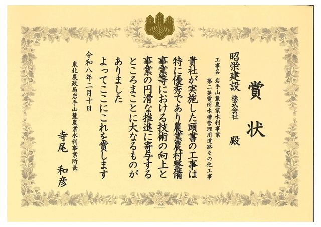 このたび、当社が施工しました「岩手山麓農業水利事業第二発電所水槽管理用道路その他工事」 が、東北農政局岩手山麓農業水利事業所長より表彰をいただきました。